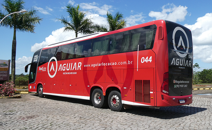 - Vissta Buss 400 sobre Scania K 370 C da empresa Aguiar Locação, de São Luís (MA), fotografado em junho de 2025 em parada no trecho maranhense da rodovia BR-402 (foto: LEXICAR).