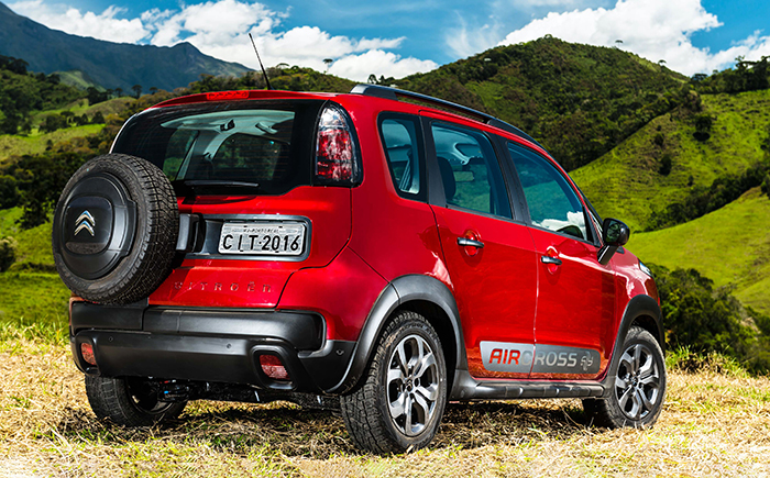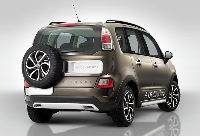 - Nas versões básicas Start e Live (na imagem) o Aircross perdeu o estepe montado externamente.