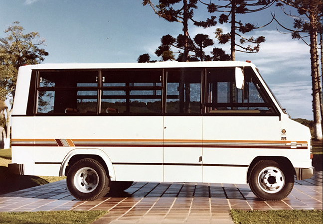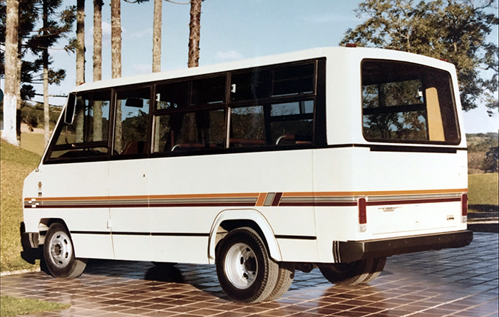 - Lançamento do Microbus Bambino, em 1982; note que o carro levava o logotipo da Marcopolo (foto: Bruno de Oliveira).
