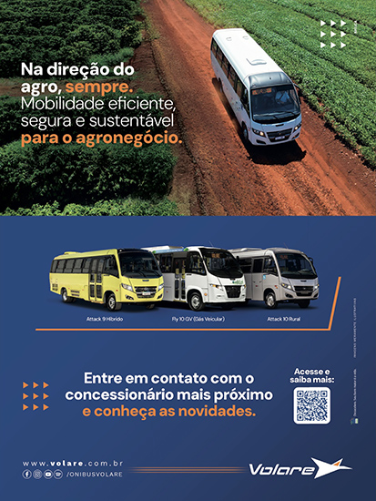 - Volare participa da feira Agrishow com três veículos próprios para utilização em zonas rurais e regiões agrícolas: Fly 10 a gás veicular e biometano, Attack 9 híbrido a etanol e o micro Attack 10 Rural, de 10 t, com motor de 175 cv, câmbio manual de seis marchas e 39 lugares – versão do modelo lançado em 2024 dotada de suspensão elevada, pneus mistos, bloqueio do diferencial, protetor de cárter e tanque de combustível, saia mais alta, maiores ângulos de entrada e saída e bancos revestidos com material lavável (04/25)