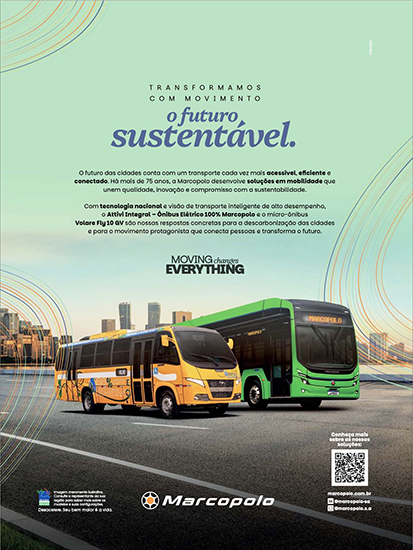 - Publicidade Marcopolo de agosto de 2025, extensiva à Volare, divulgando dois de seus modelos sustentáveis - Fly 10 GV e elétrico Attivi.