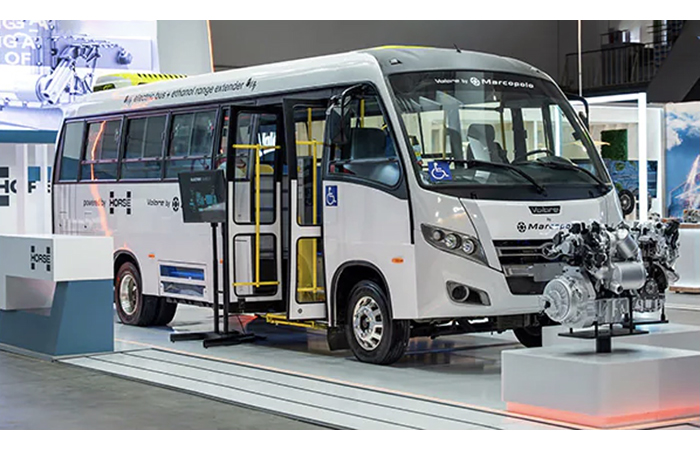 - Híbrido Volare Attack 9, acompanhado de seu motor Horse, exposto na feira Busworld Europa 2025, em Bruxelas.