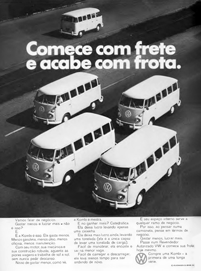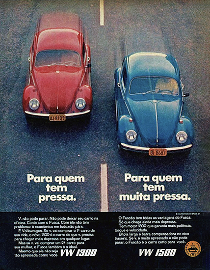 Durante mais de dez anos a Volkswagen (lê-se Folks-va-guen) produziu apenas três modelos de carros, todos com os mesmos componentes mecânicos. Mas que carros! O VW sedã, aqui popularizado como Fusca, concebido na década de 30 pelo genial Ferdinand Porsche, trazendo ousadas e inéditas soluções construtivas para a época, do qual mais de 20 milhões de unidades foram construídas (mais de 3.300.00 só no Brasil), foi eleito pela imprensa especializada internacional um dos três carros mais importantes do século XX. A Kombi, brilhante projeto de utilitário, prático e racional, até recentemente foi, mais de 50 anos depois de lançado, líder inconteste no mercado nacional de vans e furgões, com 1/3 das vendas do segmento em 2010. Finalmente, o Karmann-Ghia, ícone mundial nos anos 50 e 60, desenhado pelo studio Ghia, na Itália, desejo de consumo de todo jovem brasileiro das décadas de 60 e 70.