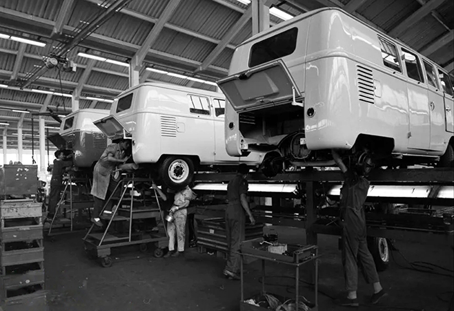 Em março de 1953, em associação ao grupo brasileiro Monteiro Aranha (com 20% do capital), a Volkswagen inaugurou linha de fabricação própria no país, em um galpão alugado no bairro do Ipiranga, em São Paulo (SP), iniciando a montagem de Kombis e Sedans 1200 com componentes importados e apenas 12 operários. Em cinco anos, 2.820 veículos seriam ali construídos, dos quais 552 Kombis, com 25% de conteúdo nacional em peso (20% em valor). Entre os itens de fornecimento local estavam: baterias, pneus, todos os artigos de borracha, vidros, bancos, revestimento interno, material plástico, escapamento e silencioso, frisos decorativos, calotas e toda a fiação elétrica.