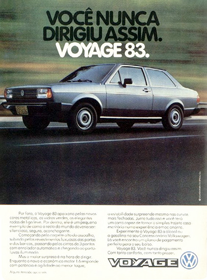 Visando o mercado externo, em janeiro de 1983 foi lançado o Voyage de quatro portas, equipado com motor 1.6 refrigerado a água (gasolina ou álcool), câmbio “longo” ou normal e travas de segurança nas portas traseiras. Em novembro, na 1ª Feira do Automóvel a Álcool, a Volkswagen pela primeira vez apresentou ao público seu sedã de luxo Santana e o esportivo Gol GT, a serem lançados no ano seguinte. Também foi mostrado o Voyage Tecno, carro conceito sem maiores atrativos estéticos, mas com motor 1.8 de 16 válvulas, duplo comando, ignição eletrônica e 139 cv, recheado de recursos eletrônicos que só muitos anos depois se veriam aplicados na produção corrente: painel digital, computador de bordo com sintetizador de voz, piloto automático, abertura e fechamento remoto das portas, bancos elétricos com memória, luz baixa automática ao cruzar com outros veículos, tecla para interrupção do motor nos sinais e funcionamento automático ao engatar a primeira marcha.
